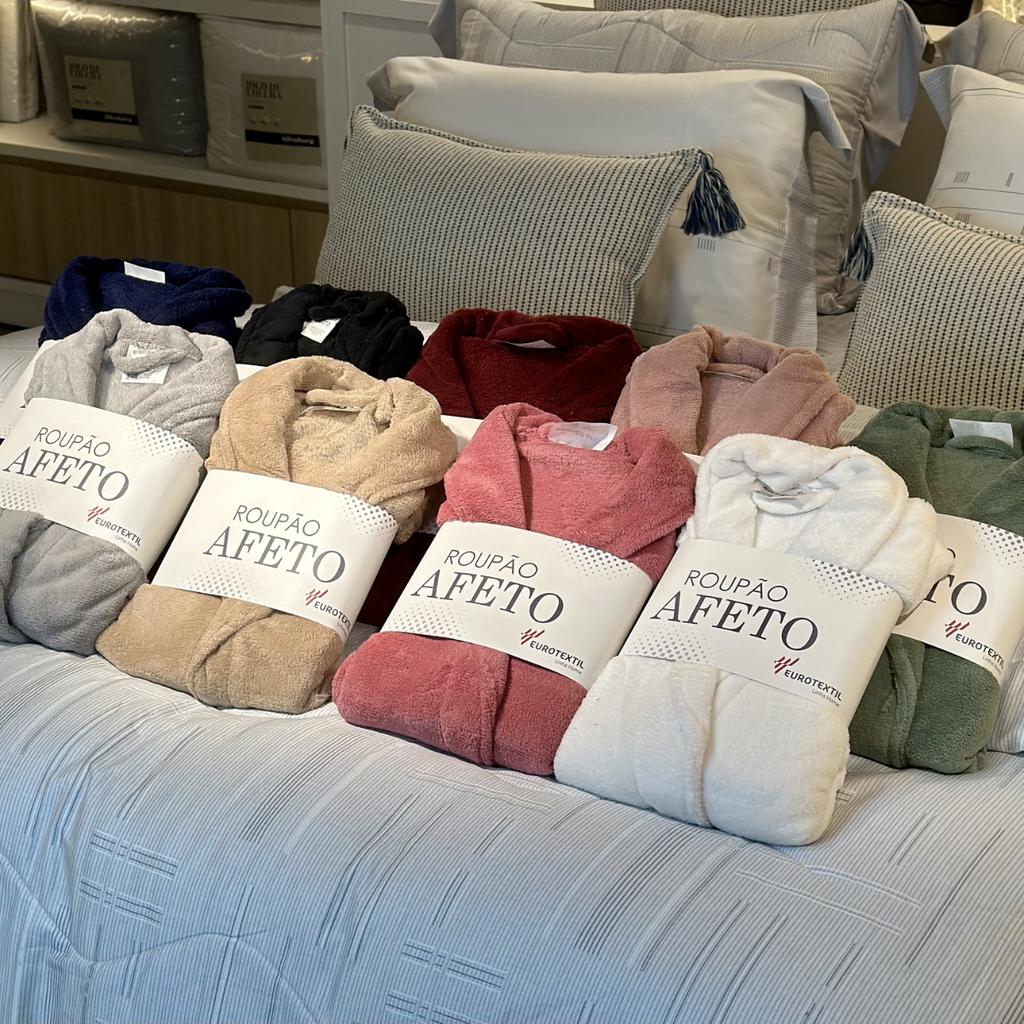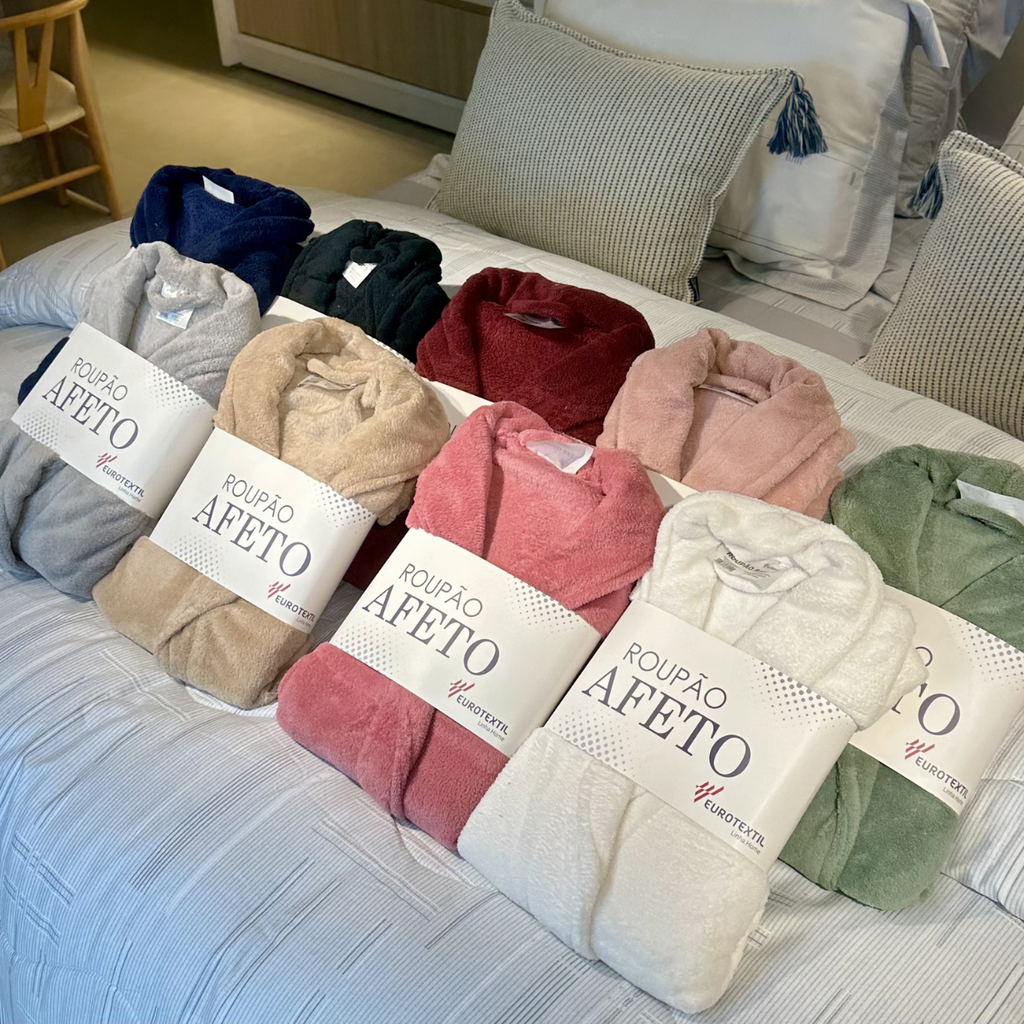 Sinta-se abraçado todos os dias com o conforto do Roupão Afeto. Aconchego, calor e qualidade Eurotextil — garanta o seu na Casa Nix.